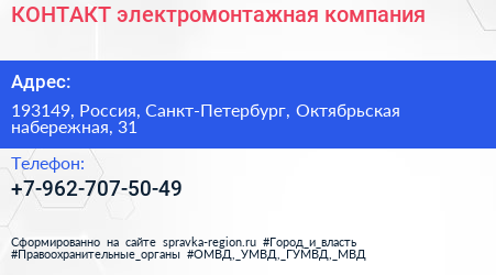 КОНТАКТ, электромонтажная компания по адресу 193149, Россия, Санкт-Петербург, Октябрьская набережная, 31 в дальнейшем Организация, размещена в следующих категориях: