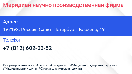 Меридиан, научно-производственная фирма по адресу 197198, Россия, Санкт-Петербург, Блохина, 19 в дальнейшем Организация, размещена в следующих категориях: