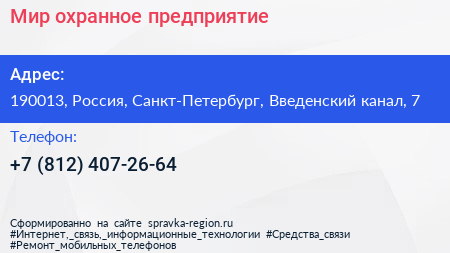 Мир, охранное предприятие по адресу 190013, Россия, Санкт-Петербург, Введенский канал, 7 в дальнейшем Организация, размещена в следующих категориях:
