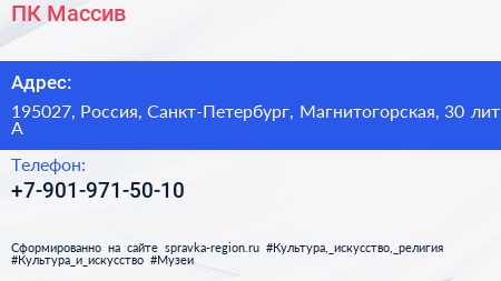 ПК Массив по адресу 195027, Россия, Санкт-Петербург, Магнитогорская, 30 лит А в дальнейшем Организация, размещена в следующих категориях: