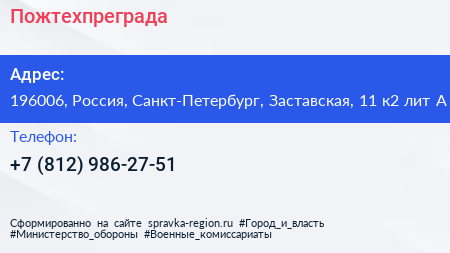 Пожтехпреграда по адресу 196006, Россия, Санкт-Петербург, Заставская, 11 к2 лит А в дальнейшем Организация, размещена в следующих категориях: