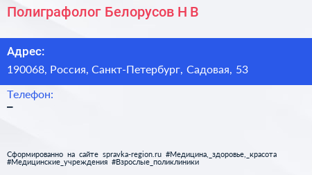 Полиграфолог Белорусов Н.В. по адресу 190068, Россия, Санкт-Петербург, Садовая, 53 в дальнейшем Организация, размещена в следующих категориях: