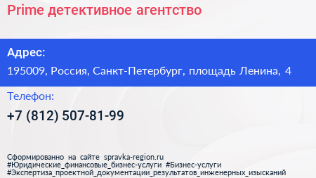 Prime, детективное агентство по адресу 195009, Россия, Санкт-Петербург, площадь Ленина, 4 в дальнейшем Организация, размещена в следующих категориях: