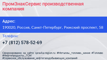 ПромЗнакСервис, производственная компания по адресу 190020, Россия, Санкт-Петербург, Рижский проспект, 58 в дальнейшем Организация, размещена в следующих категориях: