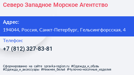 Северо-Западное Морское Агентство по адресу 194044, Россия, Санкт-Петербург, Гельсингфорсская, 4 в дальнейшем Организация, размещена в следующих категориях: