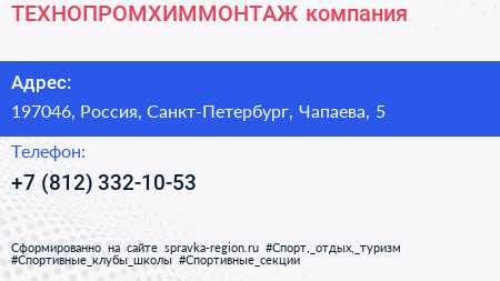 ТЕХНОПРОМХИММОНТАЖ, компания по адресу 197046, Россия, Санкт-Петербург, Чапаева, 5 в дальнейшем Организация, размещена в следующих категориях: