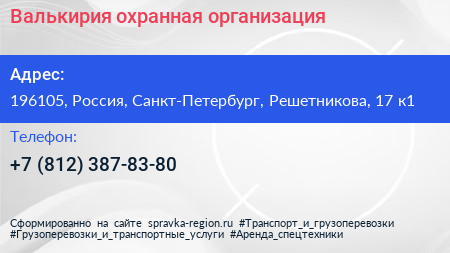 Валькирия, охранная организация по адресу 196105, Россия, Санкт-Петербург, Решетникова, 17 к1 в дальнейшем Организация, размещена в следующих категориях:
