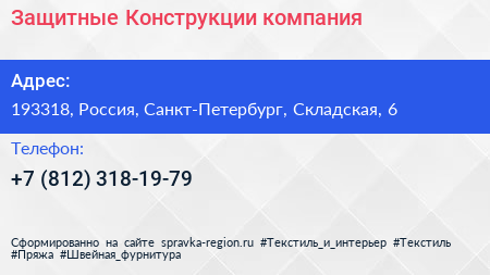 Защитные Конструкции, компания по адресу 193318, Россия, Санкт-Петербург, Складская, 6 в дальнейшем Организация, размещена в следующих категориях: