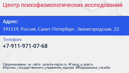 Центр психофизиологических исследований по адресу 191119, Россия, Санкт-Петербург, Звенигородская, 22 в дальнейшем Организация, размещена в следующих категориях: