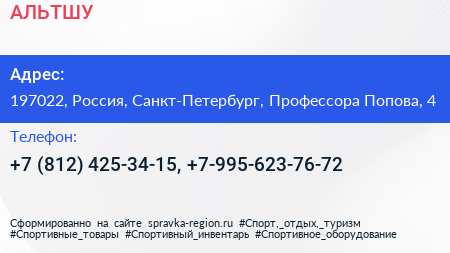 АЛЬТШУ по адресу 197022, Россия, Санкт-Петербург, Профессора Попова, 4 в дальнейшем Организация, размещена в следующих категориях:
