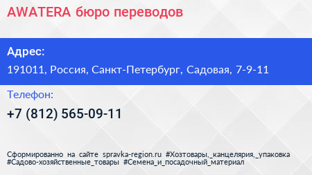 AWATERA, бюро переводов по адресу 191011, Россия, Санкт-Петербург, Садовая, 7-9-11 в дальнейшем Организация, размещена в следующих категориях: