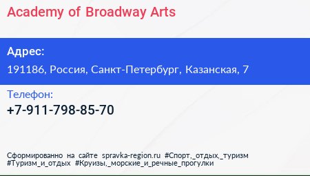 Academy of Broadway Arts по адресу 191186, Россия, Санкт-Петербург, Казанская, 7 в дальнейшем Организация, размещена в следующих категориях: