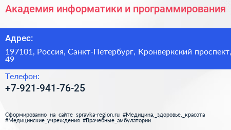 Академия информатики и программирования по адресу 197101, Россия, Санкт-Петербург, Кронверкский проспект, 49 в дальнейшем Организация, размещена в следующих категориях: