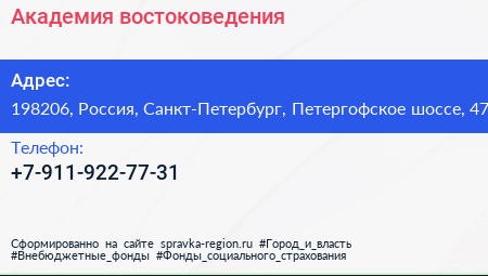 Академия востоковедения по адресу 198206, Россия, Санкт-Петербург, Петергофское шоссе, 47 в дальнейшем Организация, размещена в следующих категориях: