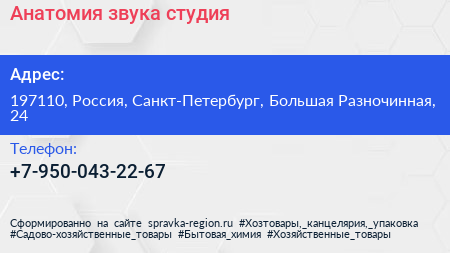 Анатомия звука, студия по адресу 197110, Россия, Санкт-Петербург, Большая Разночинная, 24 в дальнейшем Организация, размещена в следующих категориях: