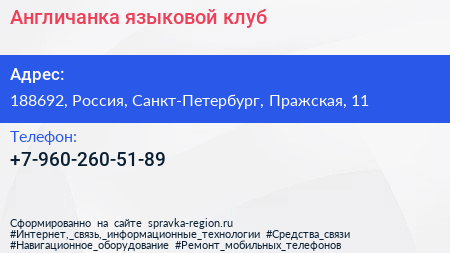 Англичанка, языковой клуб по адресу 188692, Россия, Санкт-Петербург, Пражская, 11 в дальнейшем Организация, размещена в следующих категориях:
