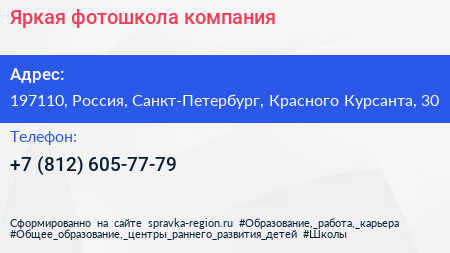Яркая фотошкола, компания по адресу 197110, Россия, Санкт-Петербург, Красного Курсанта, 30 в дальнейшем Организация, размещена в следующих категориях: