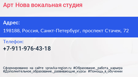 Арт Нова, вокальная студия по адресу 198188, Россия, Санкт-Петербург, проспект Стачек, 72 в дальнейшем Организация, размещена в следующих категориях: