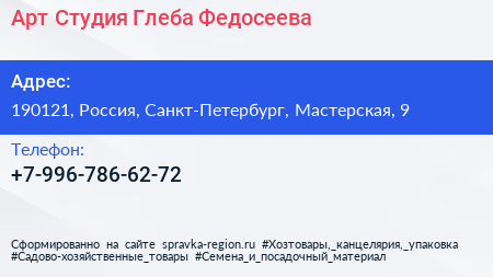 Арт-Студия Глеба Федосеева по адресу 190121, Россия, Санкт-Петербург, Мастерская, 9 в дальнейшем Организация, размещена в следующих категориях: