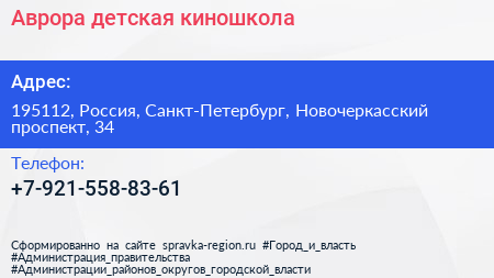 Аврора, детская киношкола по адресу 195112, Россия, Санкт-Петербург, Новочеркасский проспект, 34 в дальнейшем Организация, размещена в следующих категориях: