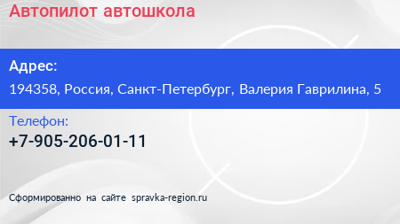 Автопилот, автошкола по адресу 194358, Россия, Санкт-Петербург, Валерия Гаврилина, 5 в дальнейшем Организация, размещена в следующих категориях: