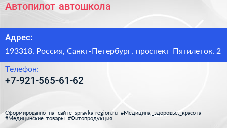 Автопилот, автошкола по адресу 193318, Россия, Санкт-Петербург, проспект Пятилеток, 2 в дальнейшем Организация, размещена в следующих категориях: