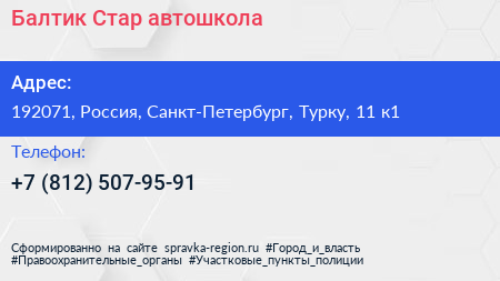 Балтик-Стар, автошкола по адресу 192071, Россия, Санкт-Петербург, Турку, 11 к1 в дальнейшем Организация, размещена в следующих категориях:
