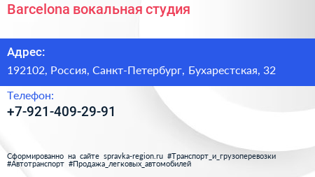 Barcelona, вокальная студия по адресу 192102, Россия, Санкт-Петербург, Бухарестская, 32 в дальнейшем Организация, размещена в следующих категориях: