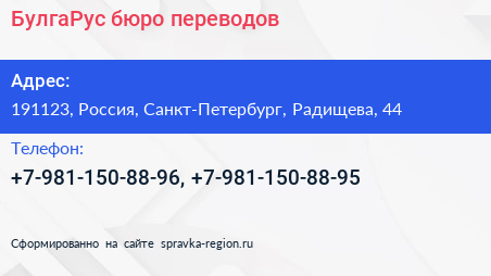 БулгаРус, бюро переводов по адресу 191123, Россия, Санкт-Петербург, Радищева, 44 в дальнейшем Организация, размещена в следующих категориях: