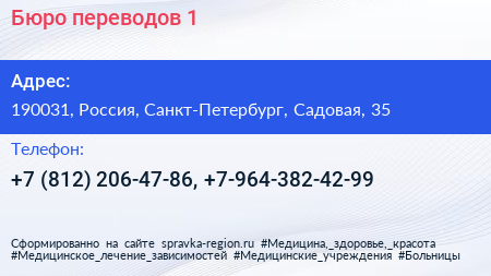 Бюро переводов №1 по адресу 190031, Россия, Санкт-Петербург, Садовая, 35 в дальнейшем Организация, размещена в следующих категориях: