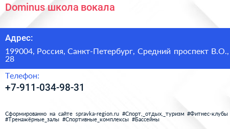 Dominus, школа вокала по адресу 199004, Россия, Санкт-Петербург, Средний проспект В.О., 28 в дальнейшем Организация, размещена в следующих категориях:
