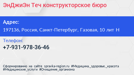 ЭнДжиЭн Теч, конструкторское бюро по адресу 197136, Россия, Санкт-Петербург, Газовая, 10 лит Н в дальнейшем Организация, размещена в следующих категориях: