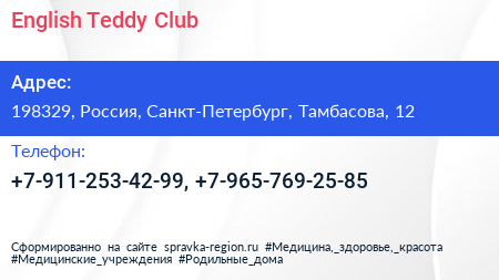 English Teddy Club по адресу 198329, Россия, Санкт-Петербург, Тамбасова, 12 в дальнейшем Организация, размещена в следующих категориях:
