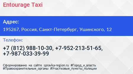Entourage Taxi по адресу 195267, Россия, Санкт-Петербург, Ушинского, 12 в дальнейшем Организация, размещена в следующих категориях: