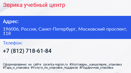 Эврика, учебный центр по адресу 196006, Россия, Санкт-Петербург, Московский проспект, 118 в дальнейшем Организация, размещена в следующих категориях: