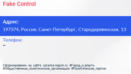 Fake Control по адресу 197374, Россия, Санкт-Петербург, Стародеревенская, 13 в дальнейшем Организация, размещена в следующих категориях: