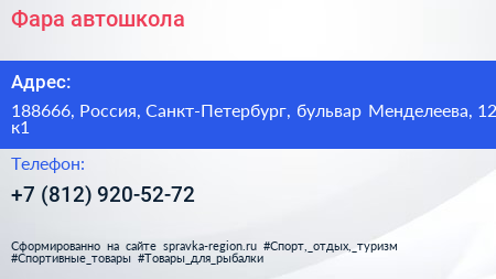 Фара, автошкола по адресу 188666, Россия, Санкт-Петербург, бульвар Менделеева, 12 к1 в дальнейшем Организация, размещена в следующих категориях:
