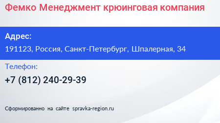 Фемко-Менеджмент, крюинговая компания по адресу 191123, Россия, Санкт-Петербург, Шпалерная, 34 в дальнейшем Организация, размещена в следующих категориях: