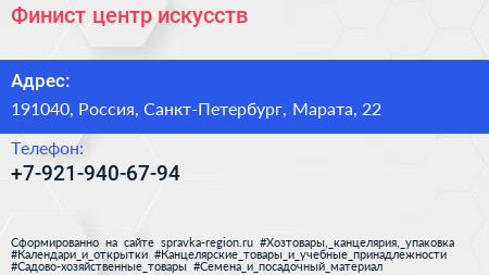 Финист, центр искусств по адресу 191040, Россия, Санкт-Петербург, Марата, 22 в дальнейшем Организация, размещена в следующих категориях:
