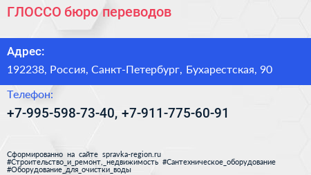 ГЛОССО, бюро переводов по адресу 192238, Россия, Санкт-Петербург, Бухарестская, 90 в дальнейшем Организация, размещена в следующих категориях: