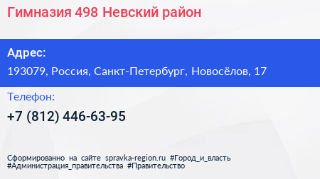 Гимназия №498, Невский район по адресу 193079, Россия, Санкт-Петербург, Новосёлов, 17 в дальнейшем Организация, размещена в следующих категориях: