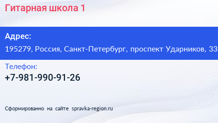 Гитарная школа №1 по адресу 195279, Россия, Санкт-Петербург, проспект Ударников, 33 в дальнейшем Организация, размещена в следующих категориях: