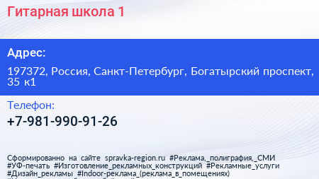 Гитарная школа №1 по адресу 197372, Россия, Санкт-Петербург, Богатырский проспект, 35 к1 в дальнейшем Организация, размещена в следующих категориях:
