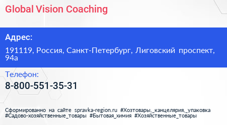 Global Vision Coaching по адресу 191119, Россия, Санкт-Петербург, Лиговский проспект, 94а в дальнейшем Организация, размещена в следующих категориях: