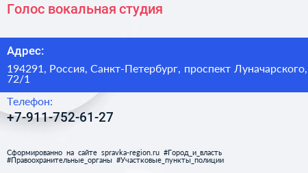 Голос, вокальная студия по адресу 194291, Россия, Санкт-Петербург, проспект Луначарского, 72/1 в дальнейшем Организация, размещена в следующих категориях: