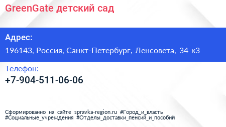 GreenGate, детский сад по адресу 196143, Россия, Санкт-Петербург, Ленсовета, 34 к3 в дальнейшем Организация, размещена в следующих категориях: