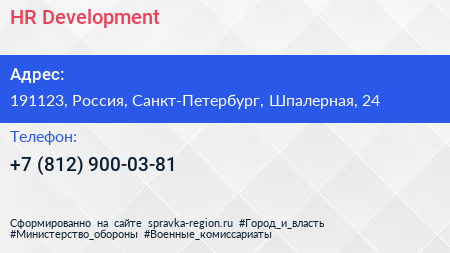 HR-Development по адресу 191123, Россия, Санкт-Петербург, Шпалерная, 24 в дальнейшем Организация, размещена в следующих категориях: