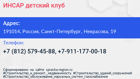 ИНСАР, детский клуб по адресу 191014, Россия, Санкт-Петербург, Некрасова, 19 в дальнейшем Организация, размещена в следующих категориях: