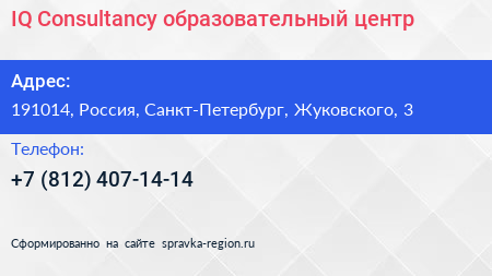 IQ Consultancy, образовательный центр по адресу 191014, Россия, Санкт-Петербург, Жуковского, 3 в дальнейшем Организация, размещена в следующих категориях: