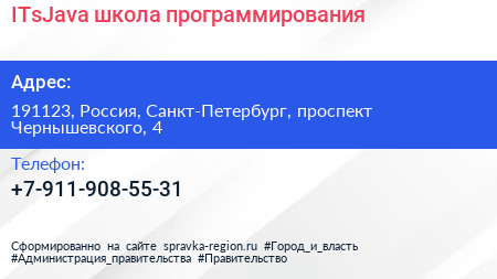ITsJava, школа программирования по адресу 191123, Россия, Санкт-Петербург, проспект Чернышевского, 4 в дальнейшем Организация, размещена в следующих категориях: